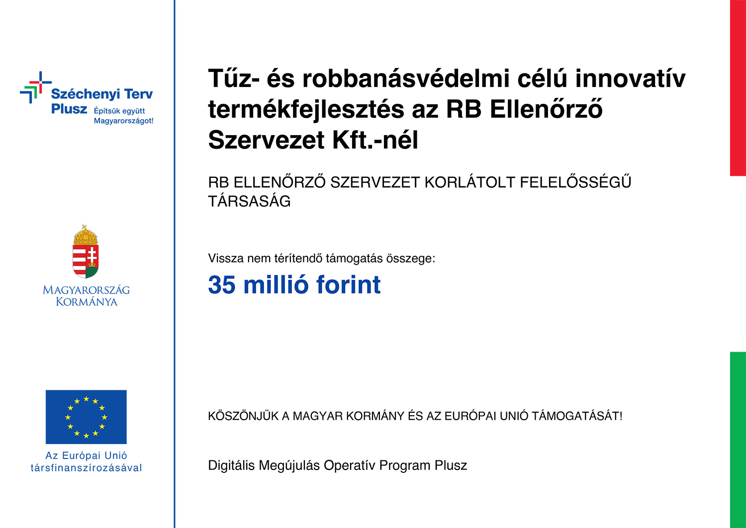A Digitális Megújulás Operatív Program Plusz keretén belül a Energiaügyi Minisztérium, mint Támogató által DIMOP_PLUSZ-1.1.2/A-24 azonosító számon meghirdetett felhívás alapján a RB Ellenőrző Szervezet Kft által 2025.05.30-án benyújtott „és robbanásvédelmi célú innovatív termékfejlesztés az RB Ellenőrző Szervezet Kft.-nél” támogatási kérelmet a Támogató elbírálta, és támogatásra alkalmasnak minősítette.
